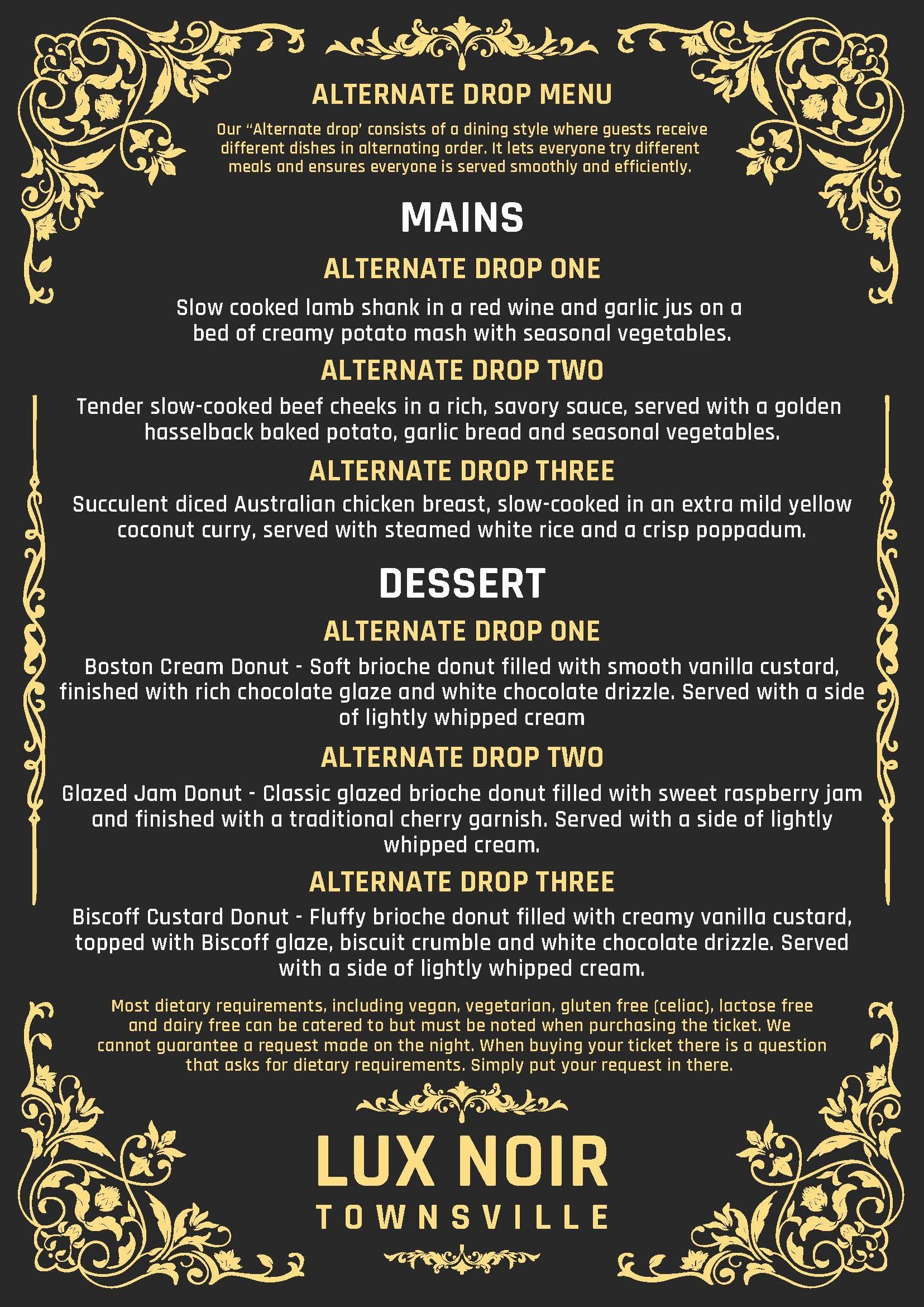 Most dietary requirements, including vegan, vegetarian, gluten-free/ celiac, lactose-free and dairy-free, can be catered to but must be noted when purchasing the ticket. Lux Noir cannot guarantee a request if it is made on the night. When buying your ticket for one of our shows in Townsville, there is a question that asks for dietary requirements. Simply put your request in there.